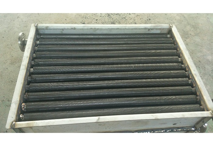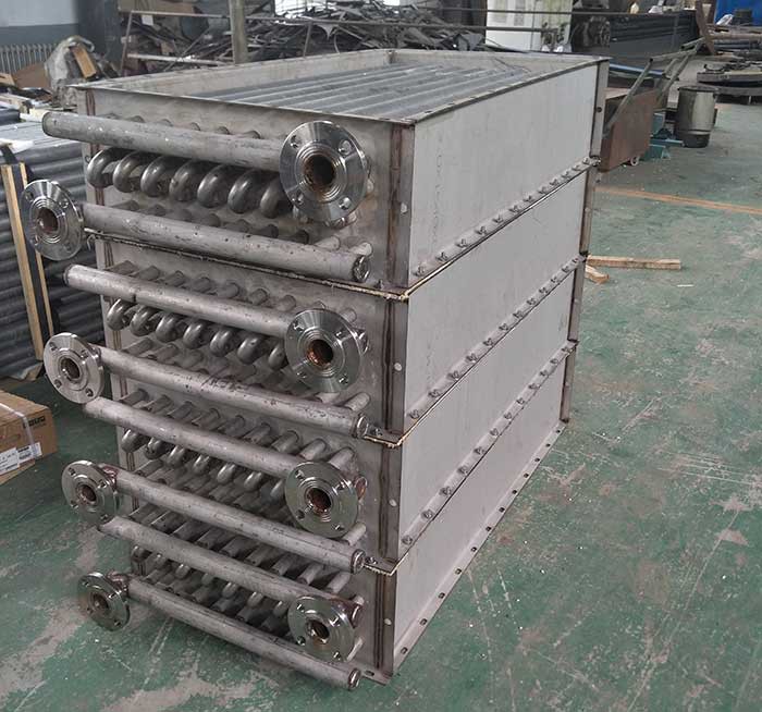 不銹鋼換熱器采用鋁軋翅片管制成,工藝科學,傳熱性能好,使用壓力不許超過12kg/cm2,根據熱負荷大小分為2或3排二種管束排列形式。